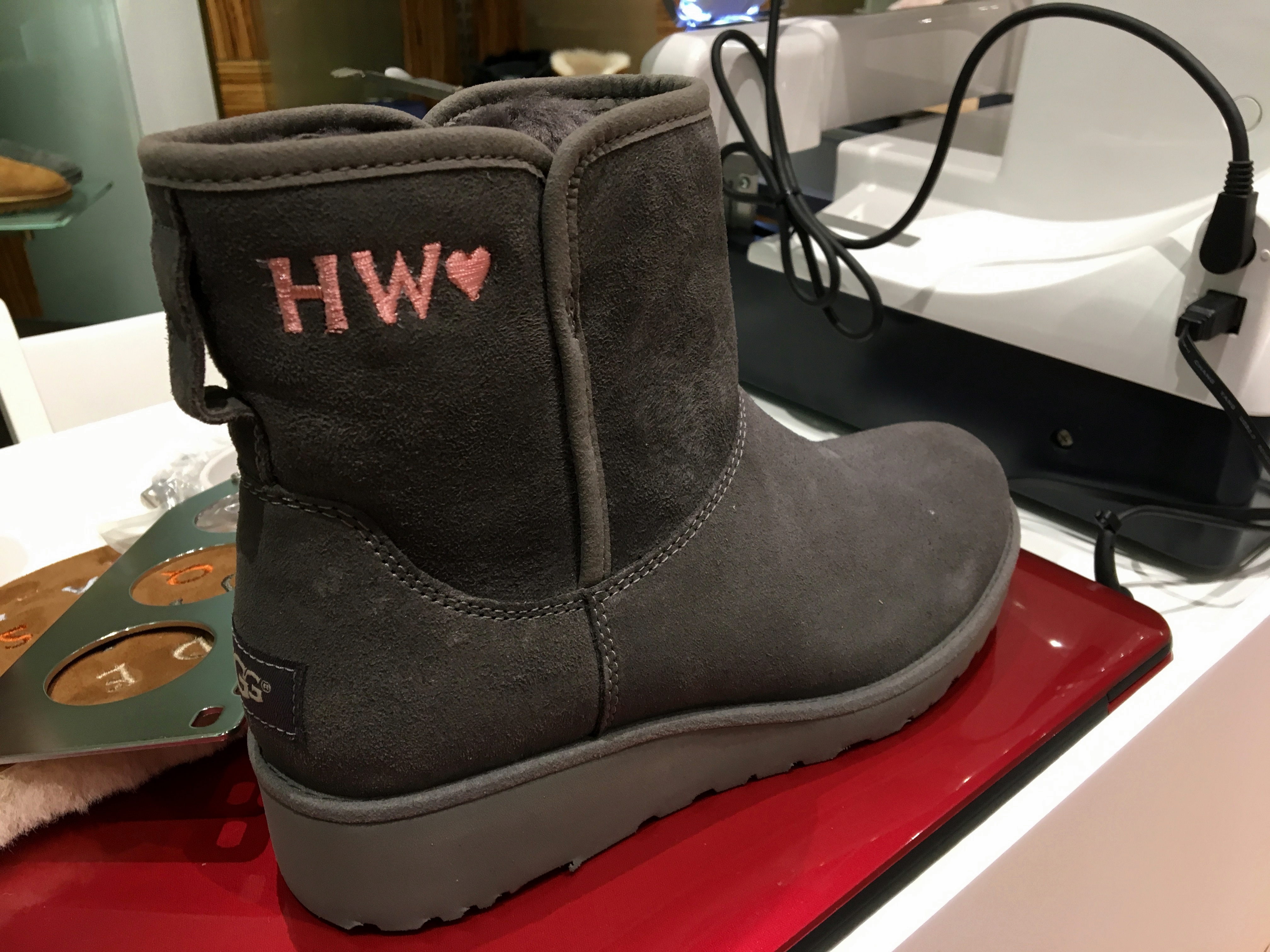 現場請賀軍翔挑選送老婆的鞋款,提供免費繡字服務,(耶誕前夕趕快帶情人、家人去體驗唷!),賀軍翔選了H跟W兩個字母再加一個粉紅愛心,他說:『字母是我們兩個的代號,選擇粉愛心是因為搭在灰色鞋款上會比較跳。』,連配色都考慮到了,不得不稱讚小美真是暖心。(這時候是不是分數狂飆中XD)