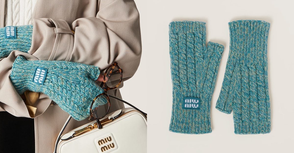 MIUMIU這雙羊毛混羊絨手套不論是造型還是配色上都深深的打中了少女的心!藍綠色的混色織紋遠看繽紛可愛,近看又充滿細節,可以露出手指的設計時髦又方便活動,搭配品牌LOGO標誌增添精緻感,妞妞們今年冬天想要收編一款MIUMIU的冬季單品就是它了!