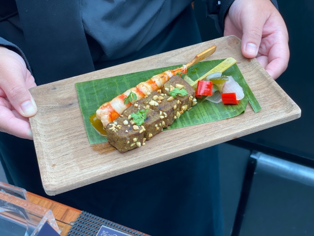 泰式「沙嗲美國牛小排串&明蝦」,嚴選美國牛小排串和明蝦當主食材,搭配東南亞中最有名的「沙嗲」製成的烤串,帶點果香味,吃起來酸甜交織,一旁還有醃漬物,達到去油解膩的效果,而且最下層還放上葉菜襯底,擺盤的方式非常「泰」!