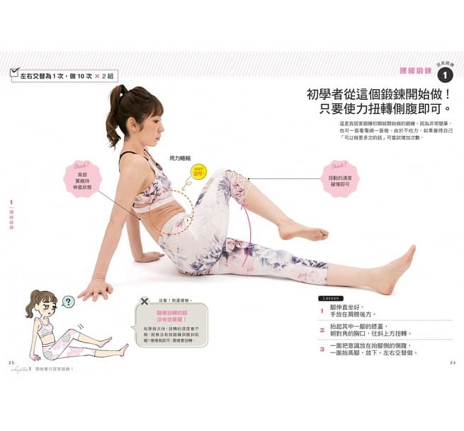 想要零贅肉的腰線?初學者也能在家裡自己練,mu教練示範只要一邊追劇一邊「使力扭轉側腹」就可以!把腳伸直坐好、手放在肩膀後方、抬起其中一腳的膝蓋,朝對角的胸口往斜上方扭轉,一面把意識放在抬腳側的側腹、一面抬高腳、放下,左右交替做就完成~