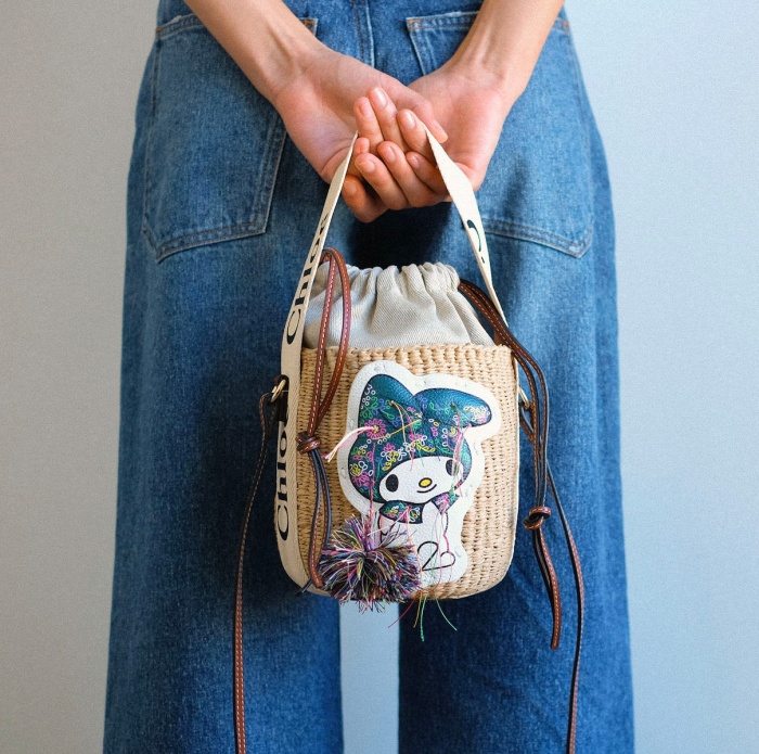這次與美樂蒂聯名的第二款就是Woody系列的編織水桶包,小巧可愛的水桶包身是由肯亞的獨立女工匠手工編織而成,正面同樣是可愛的美樂蒂My Melody 皮革貼片搭配多繽紛色彩的絨線球點綴,水桶包內裡搭配棉麻束口袋,還有一條長的皮革肩背帶,適合手提、肩背和斜背,特別的是在這個水桶包的底部,還設計了印有Chloé標誌的紅色皮革包底,喜歡美樂蒂的粉絲們必須立刻收一咖吧?