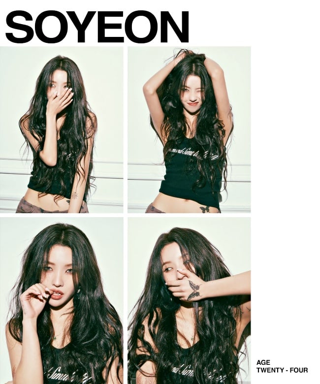團體照粉成那樣,第一波個人回歸照卻意外的走帥氣風,薇娟、Minnie、小娟、雨琦及舒華造型以灰、黑、白為主,搭配正流行的復古Y2K髮型妝容,旁邊還特別標示「成員年齡」,讓粉絲更猜不透回歸風格了(笑)!
