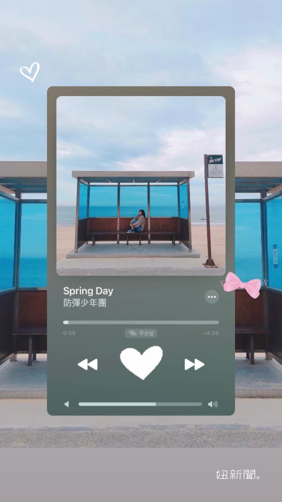 第三款是韓國現在最夯的「Photo Music」排版,先將自己正在聆聽的音樂截圖下來,並在相簿中編輯圖片,裁切到剩下音樂播放的部分。之後打開限動頁面,上傳一張自己的照片,並把版面填滿。最後一步新增音樂播放截圖,再新增與背景照同樣的相片,覆蓋住原本音樂截圖的專輯團片,最後放上一些貼圖點綴就大功告成啦~