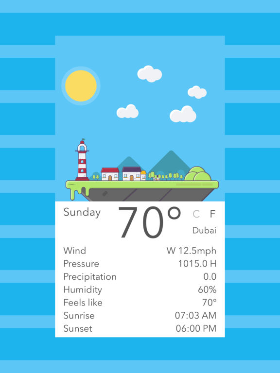 這款天氣App的名字超可愛,翻成中文就是《天氣島》!介面是一座小島,背景就是當日的天氣囉~是不是讓人看了心情很好?拉開底下的頁面,還會顯示當日天氣的詳細資訊,例如氣溫、風速、日落日出等。