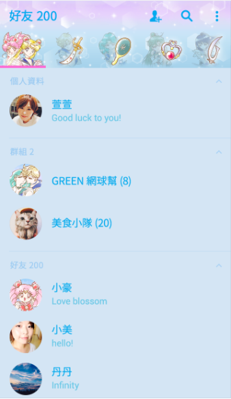 手機小姐想跟大家特別介紹的是聊天頁面的部分,背景是內部戰士的合影(金星仙子還特別摸臉眨眼,提高自己的關注度!),貼圖與連結轉換的按鈕是小月亮仙子的變身胸針!底下的每一個連結圖案也都跟動畫中戰士們使用的道具有關係呦!例如語音訊息的圖案就是動畫裡戰士們的「通訊器」。