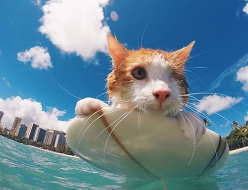 來到海邊可以將貓籠打開,讓貓咪主動走出來接觸陌生的環境,等貓咪熟悉後,可以繫上牽繩帶貓咪在沙灘上散步或是踏踏水,如果貓咪水性還不錯,可以讓咪咪穿上救身衣或繫上繩子慢慢訓練一起在衝浪板上活動,不過一切的訓練都急不得,一定得讓貓咪慢慢適應一步一步來。