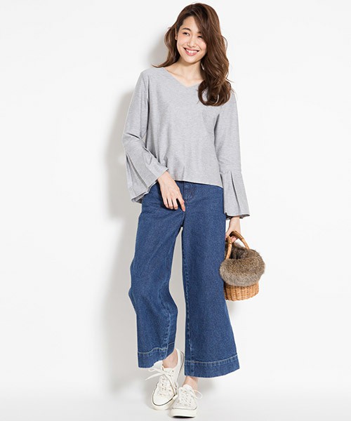 喇叭袖上衣搭配喇叭褲,寬×寬的組合看起來慵懶又隨性,加上毛毛包就很有秋天的氛圍喔!