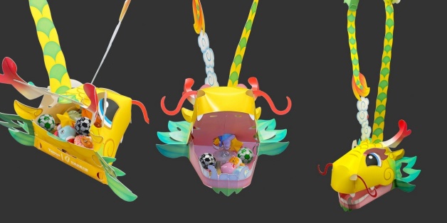 燈籠特別設計成可背式的「小龍包」(笑),龍頭可放入一些輕量的隨身物品或小玩具,龍身作為長背帶,可頸掛、側揹或斜揹,有趣的地方在於,今年在龍嘴內側的燈具上方,開了一個硬幣大小的圓孔,等張開時,上方物品會咕咚咕咚往下掉在龍嘴,可愛又不失實用性!