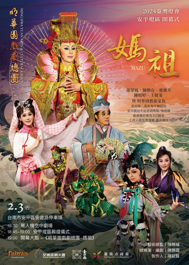 搶先登場的就是在安平燈區的開幕式,由明華園總團帶來暌違十年的藝術鉅作《媽祖》,顛覆傳統視聽的環場戲劇震撼,可見巨型鯰魚悠游於半空,觀眾席兩座升降舞台輪番上演令人摒息的飛人演出。另外還有《1624》大型戶外歌仔音樂劇,唐美雲和孫翠鳳兩大天王首次於戶外大型演出同臺飆戲,用臺灣的歌仔戲、演臺灣的故事,打造國際級演出盛會!
