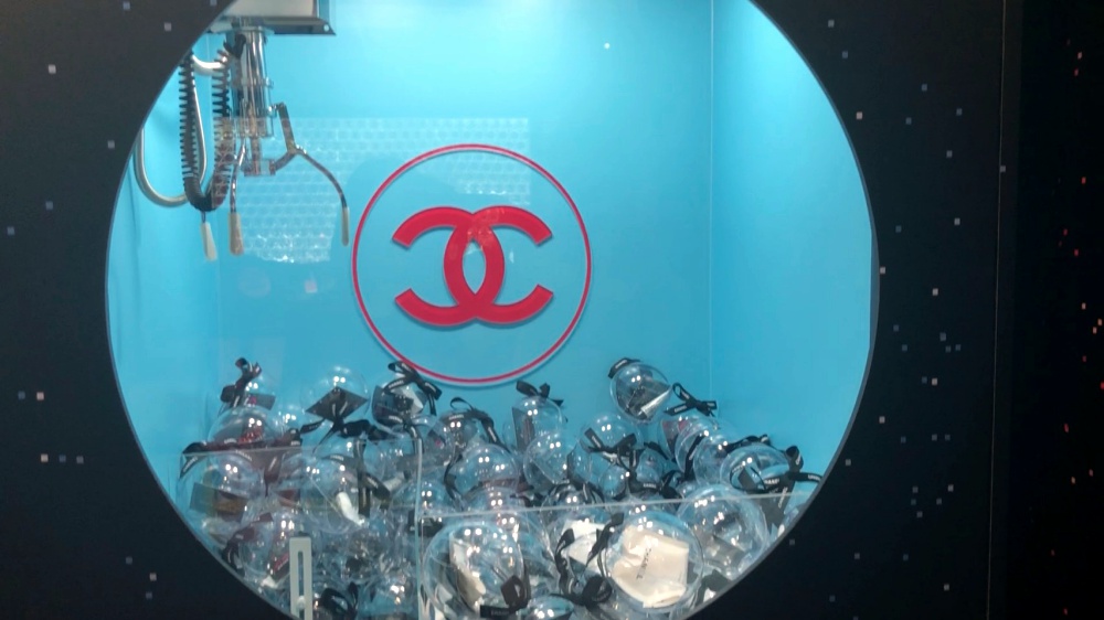 以一顆顆透明的山茶花精萃微滴粒子為靈感設計,這款遊戲機只須抓取其中的透明泡泡球,即可贏得香奈兒保養彩妝或香水試用品!(偷偷跟你們說品牌很貼心的將夾娃娃機的爪子調比較緊,夾中機率非常高!)