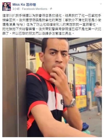 曾經榮獲金曲獎最佳新人獎的饒舌女歌手葛仲珊(Miss Ko)作風嗆辣,日前傳出她返回美國念書並打算考取偵探執照,她在臉書駁斥「難道我回家多陪爸媽就等於不做音樂要當偵探了嗎?」引發話題。目前受邀到法國巴黎和坎城演出的她,這趟旅行狀況不斷,不但行李被航空公司弄丟,這次又發生扒手偷手機的事件,她說:「結果我打了他一巴掌把手機拿回來。」霸氣舉動讓上萬名粉絲都說讚!