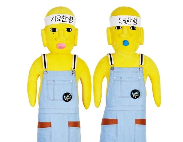 原本只在慶州的《姜食堂》才見得到的圍裙,以「淡藍色」做為主色,吊帶的部分可自由做變化,前方還有三個造型感滿分的口袋,可以供妞妞們放小妙漢玩偶(誤),而且圍裙上還有「KANG’S KITCHEN」的布徽章跟一朵小小的觔斗雲呢!