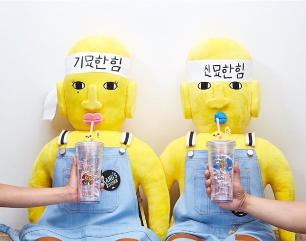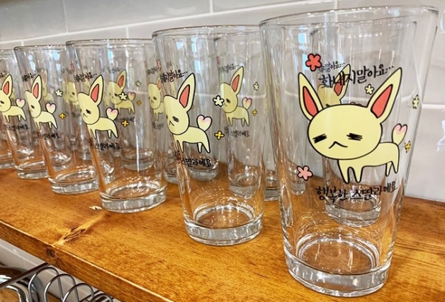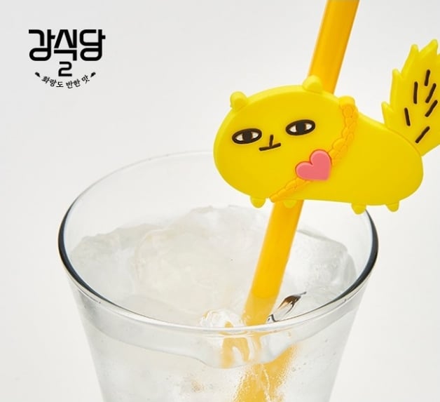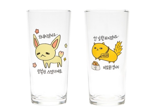 節目的吉祥物一號的貓「美妙漢」和吉祥物二號的沙漠狐狸「斯達拉」,這款玻璃杯最先搶先曝光在《姜食堂2》的SNS上,容量為435ml,斯達拉杯子上還寫著:「不要生氣喔...我是幸福的斯達拉」,美妙漢的則是:「不要慌張喔...我是美妙漢」!