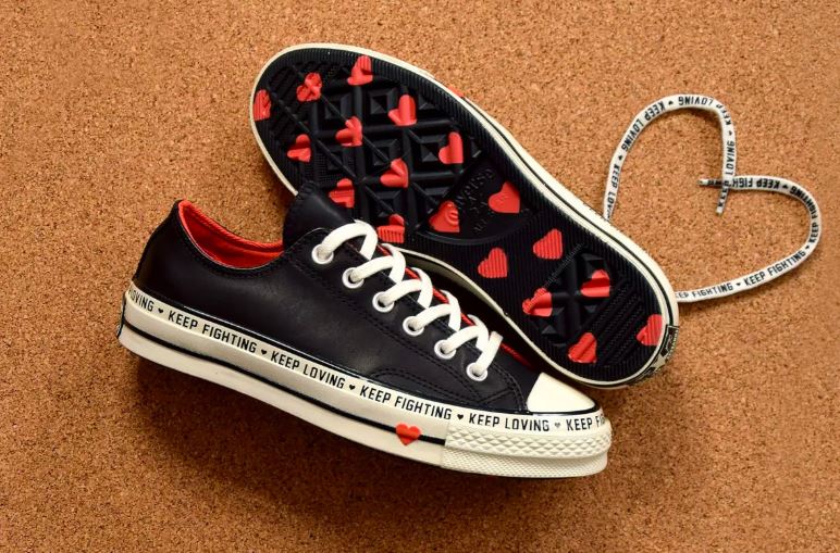 Converse在今年年初為了慶祝情人節,由Chuck Taylor 70 Low系列特地打造「Valentine’s Day」愛心限定鞋款。除了超有個性的皮革材質與「Keep Fightiing ♥ Keep Loving」字樣設計,連鞋底也不馬虎!印上滿滿的紅心,妞編輯完全感受到Converse滿滿的誠意呀~(感動落淚)