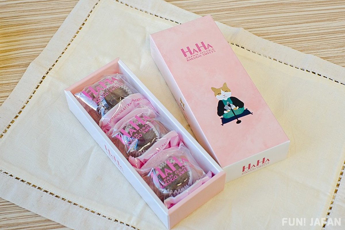 「HAHA OSAKA RAKUGO SWEETS」以大阪的傳統落語文化為主題,是一款獨特又有趣的甜點。此商品含有「從大阪道頓堀向世界傳遞「笑聲」和「甜點」」之意,淡粉色的背景上有溫馨的落語貓圖片,非常可愛。這是一款可同時感受大阪文化的奢華伴手禮,豪華的巧克力蛋糕搭配酸甜的覆盆子果醬,可讓人享受到頂級的好滋味。*售價:3入 698日圓/6入 1,188日圓(含稅)