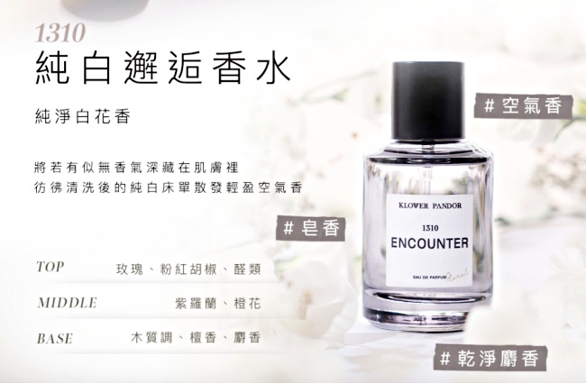 還有專業粉絲精準找到同款產品是1310號的「純白邂逅香水」,以純淨白花香為主調,前調玫瑰、粉紅胡椒、醛類、中調以紫羅蘭、橙花勾勒,最後以木質調、檀香、麝香留下尾韻,形容是「洗過的純白床單散發的輕盈空氣香」,光看文案就很初戀系、很舒華!太期待代言照了~
