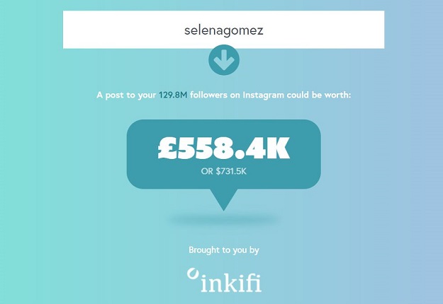Inkifi的計算數據是根據「The State of Influencer Marketing 2017」的分析報告,從2017年度5大影響人物,有賽琳娜、亞莉安娜、C羅納度、碧昂絲及泰勒斯,計算得出每位追蹤者的價值為0.0043英鎊(約台幣0.16572元)。