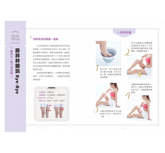 矽膠材質柔軟、彈性佳的材質結合凹凸按摩顆粒設計…這隻看似普通的棒子,其實充滿了「瘦身魔法」啊!居家放置或是隨身攜帶一隻「魔法拍拍棒」,搭配中醫師的詳解「全身1條4經絡彩圖」,每天5分鐘就能通氣血、排毒素、消水腫、解便祕、減體脂,甚至困饒已久的腰痠背痛、肩頸「頂叩叩」以及手腳冰冷問題都能「一拍而解」!想瘦胖胖腿?先浸泡熱水後,用魔法拍拍棒在大腿內側,由上往下輕拍50下,再換另一腿,擦上按摩油之後,在針對血海穴、陰包穴等重點部位(請參考書內圖)各20下~