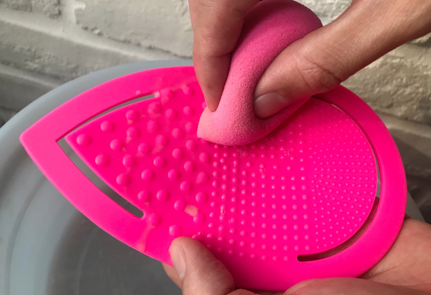 要幫美妝蛋洗澡前,記得一定將整個海綿完全浸濕,以「指腹」邊在水裡按壓,幫助水充分進到海綿裡,千萬不要用指甲摳抓,會造成美妝蛋受損喔!