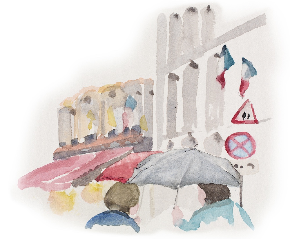 七十一歲的布魯諾先生,今天是巴黎解說課的老師,從巴克街開始在左岸七區、六區雨中漫步了六、七個小時,他總是說:「Here, you should take a picture…It’s Life.」(這,你一定要拍張照片……這就是巴黎生活……)幫忙撐傘讓我拍照、讓我走在路邊靠裡面的位置,幫忙道歉、請求店家協助,這些都讓我這個自台灣遠道而來的異國女子感到有如貴賓般的禮遇。而沿路看到的公園、花園、玫瑰花、和平、歷史、建築、質感、區內歷史悠久的優雅旅店、藝術、食物、友誼、具有特殊意義的景色、麵包、巧克力、友善……,這些元素是他對我提起無數次的,他的故鄉巴黎。