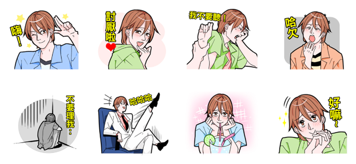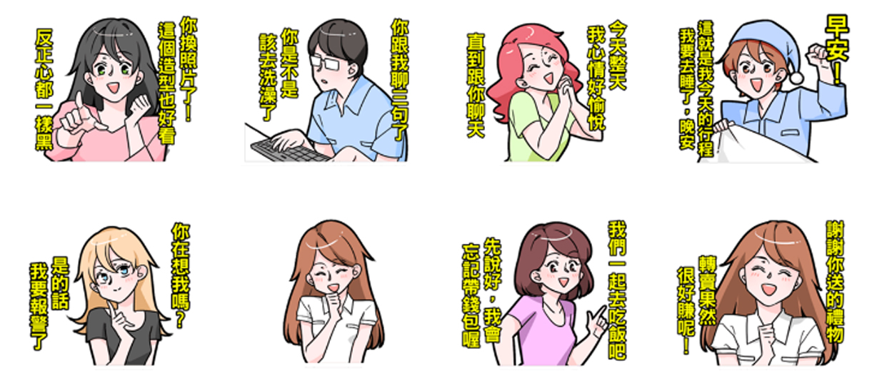 除了上述這些比較壞的對話之外,也有一般正常對話的貼圖,人物表情也是相當討厭哪~「討厭啦」表情跟手勢也很煩,現實生活有人這樣,手機小姐一定會很想給他巴下去!