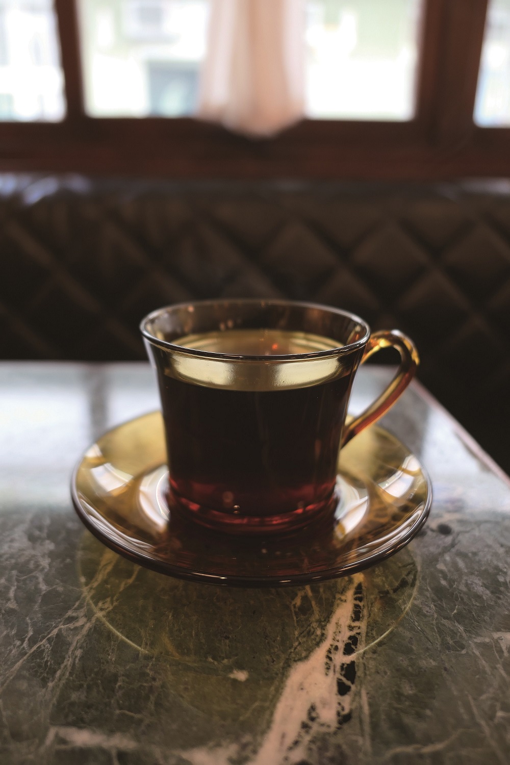 穿過鳥飛古物店,走上二樓咖啡館,又被閃著綠寶石光澤的地磚及白色暈染著淡藍色澤的仿古馬賽克磁磚吸引。推開門前,透過拱型木門的玻璃窗望進去,眼前的畫面,一股懷舊時代感襲來,好像即將走進的是舊時的日式喫茶店。咖啡館的空間用沉穩的木頭色系搭配深綠色的瓷磚及格紋皮椅沙發、絲質白色窗簾、大理石桌面等,不著痕跡地營造出時代感。讓我想起一本看過也很喜歡的《人情咖啡店》,那是一本記錄台灣早期咖啡店的風華歲月的書,作者Hally Chen用超過120 張相片及訪談,寫下16間老咖啡館的人情故事與歷史,是非常珍貴的台灣咖啡店文化紀錄。