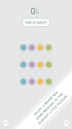 最近這種色塊點點遊戲很流行,各家遊戲都在繳盡腦汁同中求異,《Dwelp》的概念其實很簡單,想辦法把相同顏色的點點連結在一起就對了,但難的地方在於除了有限制移動的次數外,連結後的點點就綁定了無法再分開,所以在移動時要考慮得更周詳,喜歡邏輯思考的你一定要挑戰看看!