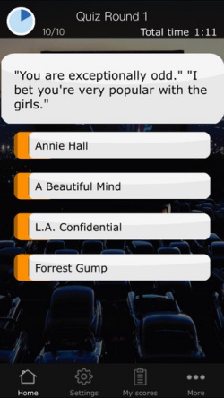 你是個電影迷,而且對電影台詞如數家珍嗎?《Movie Quiz》就是要來考驗你的台詞記憶能力,每一回合共有10題,用選擇題的方式作答,電影題庫搜羅了過去70年最受歡迎的電影,連今年才上映的《蝙蝠俠對超人》、《星際大戰:原力覺醒》都有,想知道自己會得幾分,趕快下載來驗證吧!