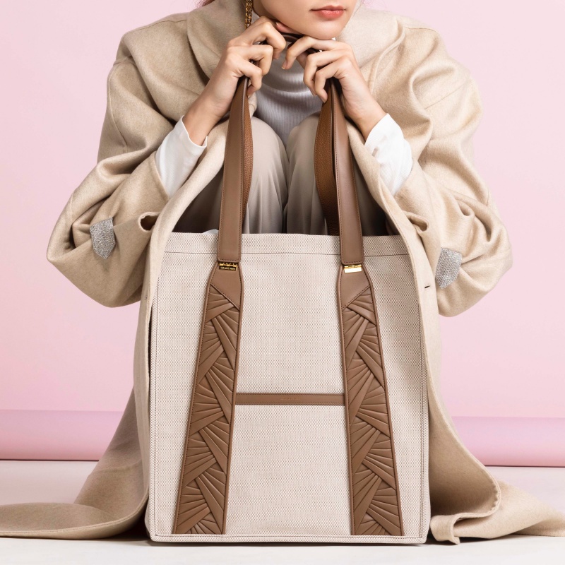同樣是Ballet Lesson系列延伸的帆布托特包款,將經典的百褶皮面以旋轉交錯的方式裝飾至包體側面,並延伸連接作為包包提袋,與之前包款不同的休閒感大包款,共有兩種尺寸,同時附有背帶可肩背或斜背,是很貼近生活的實用包款選擇。