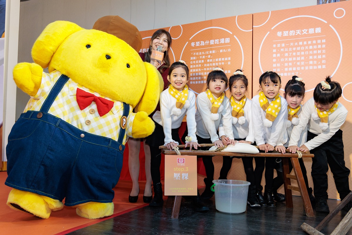 今年與三麗鷗布丁狗聯名推出的「焦糖布丁湯圓」,活動中特別嘉賓布丁狗與小朋友跳著可愛的「湯圓舞」,一起體驗湯圓的六道工序,並親自搓湯圓象徵冬至團圓幸福圓滿。布丁狗更在現場向許智勇主廚請益,學習製作湯圓的秘訣,掌握「滾水下,小火煮」的口訣,透過攪拌水流,使湯圓每顆都呈現渾圓飽滿的完美形狀。