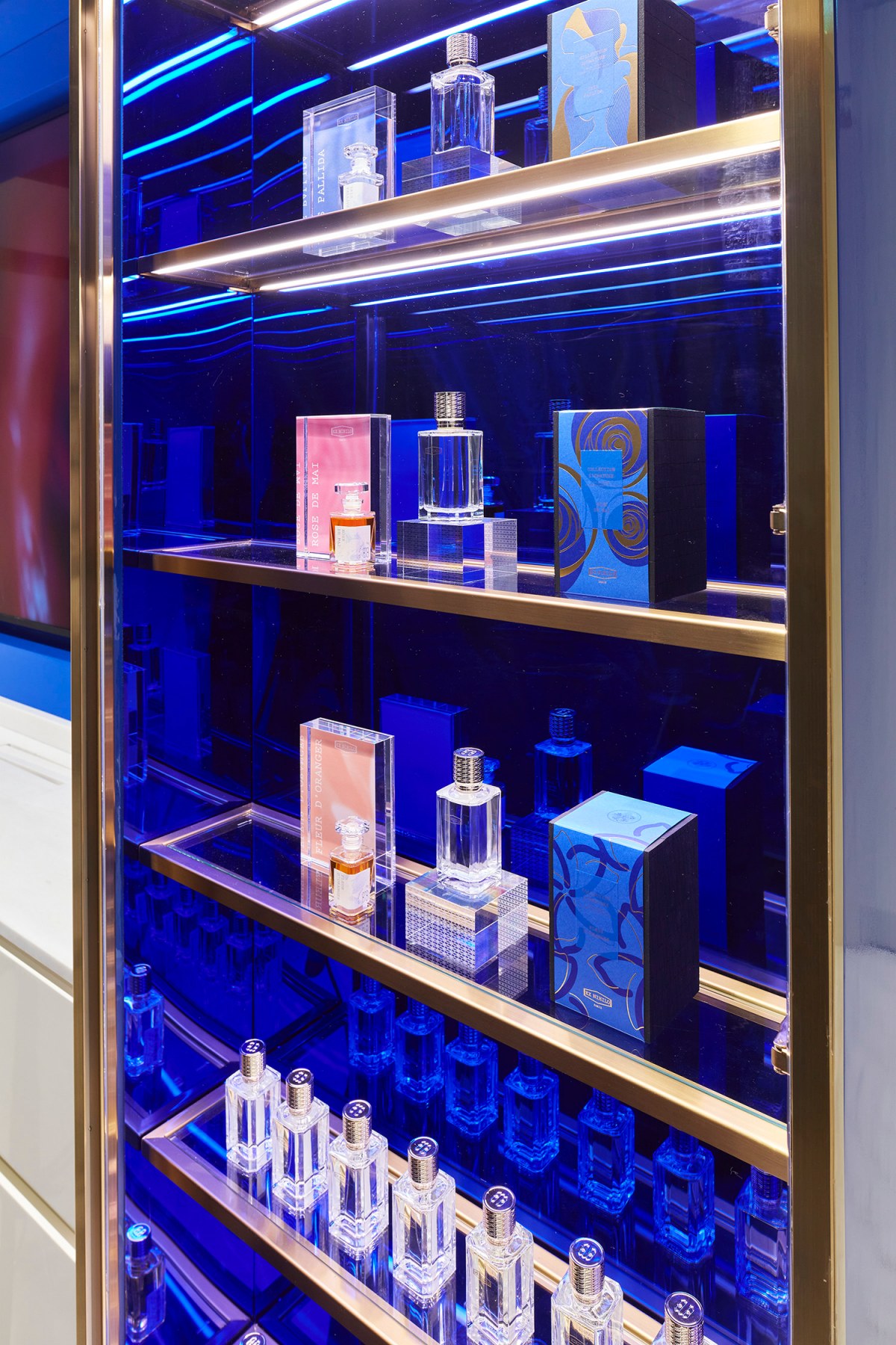 台北旗艦店在創意上的挑戰,是要把聖多諾黑352號的設計符碼整合到未來主義氛圍中:保持細節的奢華繁複,並透過在地建築語彙來昇華品牌識別。店內使用的高級素材像是白色大理石、木材和黃銅,增添質感的同時點綴空間。經典圖樣的建築元素向品牌標誌致敬,放大後更顯摩登當代。全新霧面雕刻玻璃,與EX NIHILO 品牌經典色293C藍相映成趣,與細膩刻畫的細節完美並陳,旨在提供最完整深刻的感官探索,玩味不同素材間充滿驚喜的輝映關聯。舒適的感受,是EX NIHILO為客人規劃品牌重點體驗的主要考量。