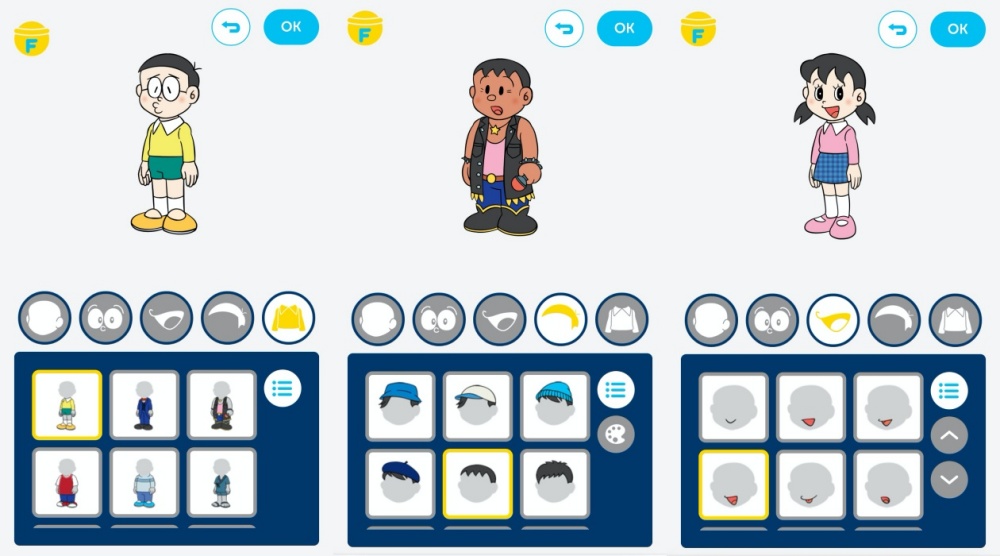 包含膚色、眼睛、嘴巴、髮型、服裝等分類,儘管各項分類中的細項種類繁多,不過大家也可以隨意排列組合,找出自己最中意的樣貌及造型。妞編輯還嘗試還原了《哆啦A夢》裡的大雄、靜香,以及化身歌王的胖虎(笑)。