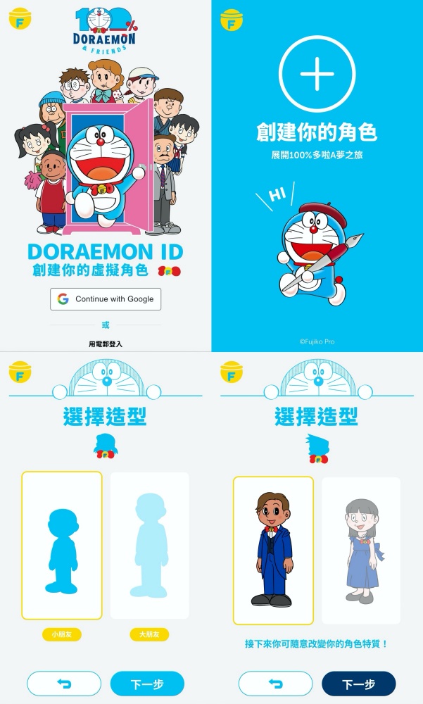 進入到創建頁面後的第一步,就是要先登入Google帳號,或是註冊一個用戶帳號,才能成功進入這趟「100%哆啦A夢之旅」!完成登入之後,即可點擊「+」來建立你的角色。經過「大小朋友」及「角色造型」的二選一後,就能開始進行捏臉啦~