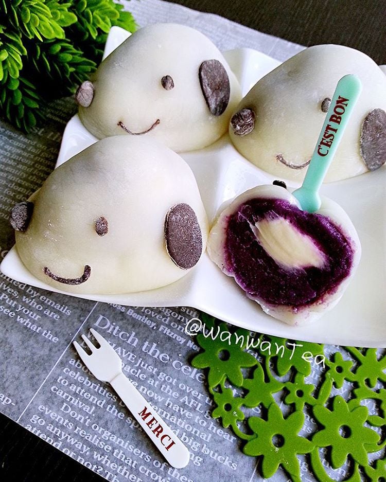 史努比麻糬中包的是紫薯餡料喔!Q彈的餅皮與飽滿的餡果然是出自媽咪的愛之手~