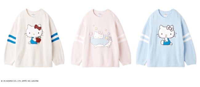 泡澡中、拿著蘋果、比出安靜手勢的Kitty…通通採用立體毛絨材質還原在聯名針織上衣上,頭上的蝴蝶結還有小亮點,特別採用「微閃緞面材質」呈現,搭配奶油米、寶寶藍、櫻花粉色系少女心秒融化!聯名開襟衫則是把主角藏在胸口,一樣搭配兩條槓槓增添運動風,扣子居然還是3D立體的熊熊、蘋果、蝴蝶結以及Kitty大頭,太犯規了吧?