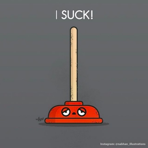 「I SUCK!」負責清理堵塞的馬桶吸盤,他的人生真的是很悲慘又糟糕,不僅要吸掉阻塞物,還人人見了都嫌噁心討厭。