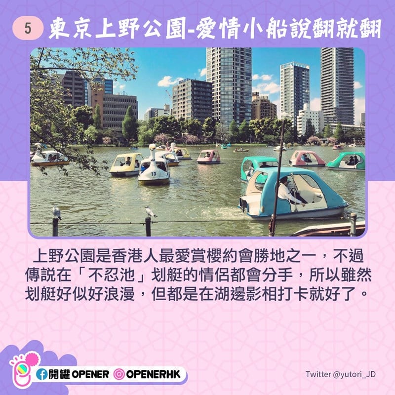 上野公園是許多人熱愛的賞櫻約會勝地之一,不過傳說在「不忍池」划艇的情侶都會分手,所以雖然划艇好似好浪漫,但還是在湖邊拍照打卡就好了?