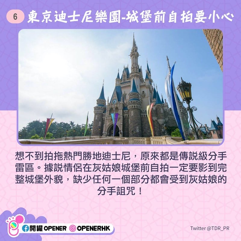 想不到約會熱門勝地迪士尼,原來都是傳說級分手雷區。據說情侶在灰姑娘城堡前自拍一定要拍到完整城堡外貌,缺少任何一個部分都會受到灰姑娘的分手詛咒!