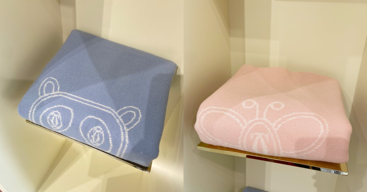 另外,在店內可以看到卡地亞Double C de Cartier肩揹包的全新色系與款式,新款的Double C de Cartier肩揹包搭配珠寶鍊帶,不論肩揹還是斜揹,都很適合,而且包蓋上的雙C標誌也完全展現屬於卡地亞的品牌魅力;還有最可愛的寶寶系列,以美麗諾羊毛和喀什米爾羊毛交織而成的寶寶毯,點綴兔子、蝴蝶與熊貓圖案,舒服又可愛~最特別的是,在遠百A13的「The Cartier Box」期間限定概念店入手生活系列的商品,就能獲得專屬的包裝服務,就連緞帶都跟一般飾品使用的不一樣!