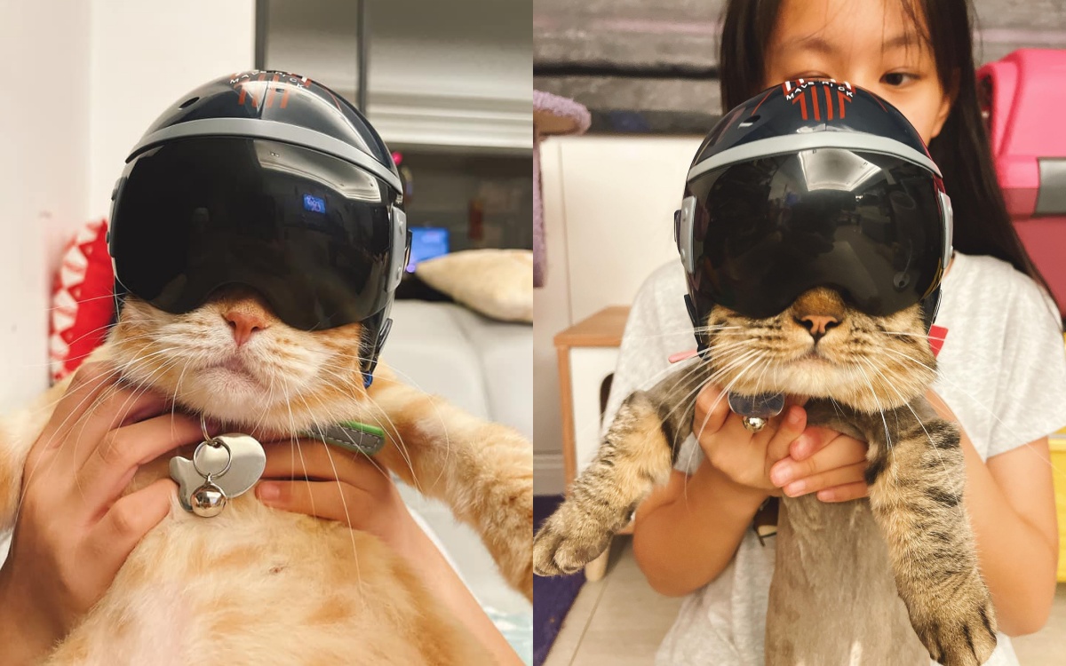 看看這頭盔的大小是不是很適合毛孩!戴上去後霸氣程度滿分,雖然看不到眼睛,但妞編輯可以透過照片感受到牠頭盔底下的銳氣,可能牠早上負責賣萌,晚上要去拯救世界一樣,而鏟屎官Donovan K. Yeh還說:「可以一杯兩用喔!」小貓貓放進杯子會不會太萌~(已融化)
