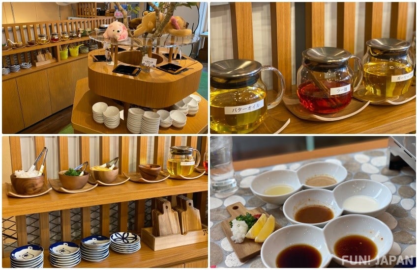 點餐完畢之後,就可以去拿火鍋沾醬和辛香料。沾醬口味相當豐富,像是北海道的知名美食「湯咖哩沾醬」、「美乃滋沾醬」、「蜂蜜檸檬」、「白芝麻醬」、「亞洲沾醬」等口味。另外,還有「橄欖油」、「蒜油」、「辣油」等,各式各樣的調味料搭配組合,大家可以依個人口味調配出自已喜愛的沾醬。