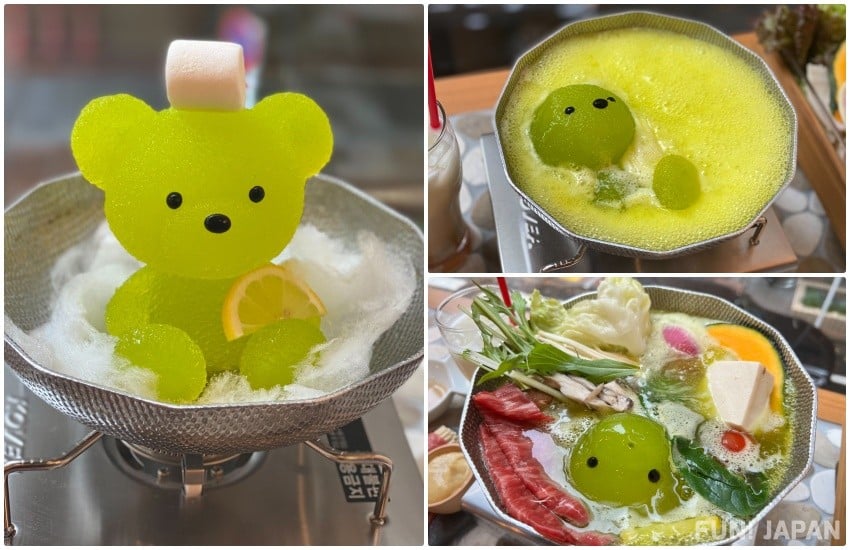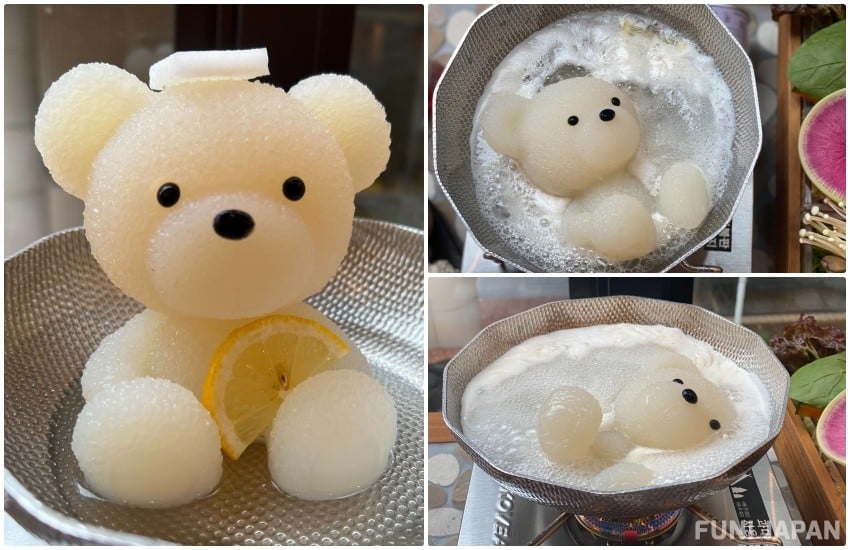 火鍋煮著煮著,小熊的身影也漸漸變小逐漸融化成湯汁,最後完全消失不見變成湯底,小熊在鍋中的模樣就像泡在暖呼呼的溫泉之中,帶來的視覺效果十分驚奇。可愛又美味的小熊溫泉涮涮鍋,保證超受女生喜歡。隨著火鍋的溫度越來越高,膠原蛋白凝固的小熊遇熱漸漸融化,一點一滴不成熊形,那畫面雖然可愛,卻又有覺得有點可憐,可愛的小熊就這樣融化不見了~這充滿強烈反差的衝擊對比,心情上還真是有點複雜。想要親眼目睹小熊漸漸消失化作一鍋美味高湯的過程,下次來日本旅行,可以把這間小熊溫泉鍋列行程唷!