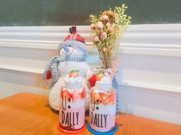 U:DALLY是韓國很有名的甜點飲品店,飲品裝的罐子很可愛,可以回收再利用。除了瓶子很吸引人之外,瓶子裡裝的甜點才是重點啊!這款草莓冰沙外觀超夢幻,粉紅色的冰沙配上滿滿的草莓果肉,整個滿出來的豐富配料,到韓國一定要拜訪一下啊!