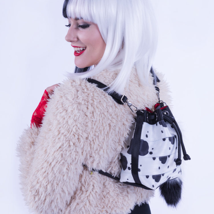 大麥町花色的後背水桶包,由類似庫伊拉模樣的模特兒拍攝真的超顯惡毒!101忠狗就這麼遇害了嗎?