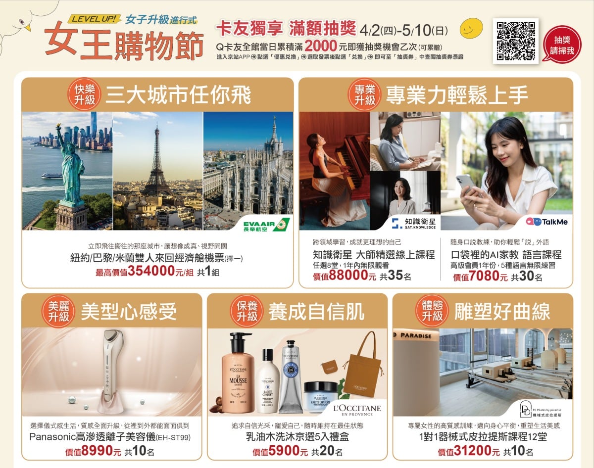 4/2(四)-5/10(日)京站提供總價值超過400萬的抽獎內容,豐富獎項除了最高價值35萬的豪華雙人機票,還有可讓您充實專業技能或雕塑體態的課程、提升生活質感小家電等多種好禮!Q卡友憑全館當日累積消費滿2000元發票,即可獲抽獎機會乙次(可累贈)。