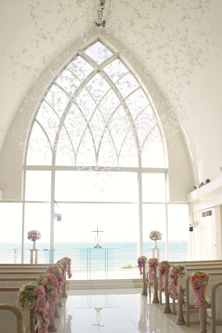 氣氛浪漫、讓人宛如置身畫中的艾葵雅教堂,以歐式花園般的造景設計擄獲人心,更被譽為最完美與沖繩大自然融為一體的美麗教堂!教堂內由天花板自然垂墜而下的綴飾,象徵喜鵲般浪漫守護新人,並附帶有氣氛悠閒而典雅的宴會廳,可在婚禮過後就近給予賓客們貼心款待!