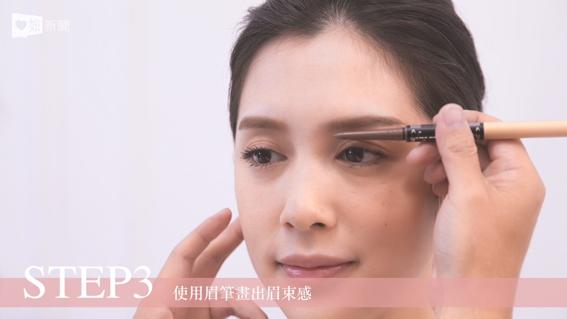 老師強調,畫眉毛可不是只要填補空隙而已,而是要有立體感、有線條,同時又能修飾臉型。首先從眉頭開始畫,使用眉粉筆可以避免下手太重,降低失誤率,同時也具備相當不錯的延展性,順著往眉尾平拉,可以畫出眉毛整體的輪廓。