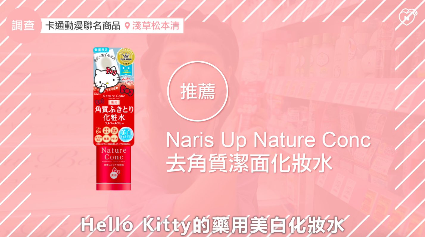 Nature Conc的藥用美白化妝水也推出Hello Kitty限定版包裝,瓶身、貼紙上都有可愛的Kitty。化妝水還有去角質的效果,搭配化妝棉在全臉擦拭,就可以每天溫和地把老廢角質代謝掉,讓肌膚看起來好透亮。