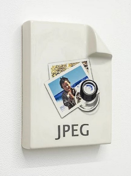 為了凸顯JPEG的意義,使其成為一件藝術品,Alan Belcher將圖檔內容排除,僅留下影像格式名稱與預設的縮圖,並做為陶瓷的雕塑品,從平面轉為立體的再創作,讓JPEG成為「名副其實」的影像標誌。