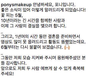 IG全文如下:「大家好,我是Pony,在這裡跟大家分享一個好消息,在花開的5月,終於能和我攜手10年的人一同收穫愛情的碩果。過去一年多都忙著籌備婚禮,所以沒能上傳更多的視頻和減少了許多活動,我會在6月的時候回歸,感謝一直關注並應援我的人~以後還請多多祝福我們。」